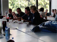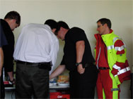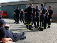 Im Anschluss an die erste Übung trennten sich die Wege von Rettungsdienst und Feuerwehr wieder, die Einsatznachbesprechung stand an. Das rettungsdienstliche Vorgehen ist ganz klar der Schwerpunkt im MANET-Projekt, die Arbeit der Feuerwehr „nur“ schmückendes Beiwerk. Dementsprechend wurden die Kameraden vom Rettungsdienst intensiv befragt, um ihre Erfahrungen auswerten zu können. Bei der Feuerwehr verlagerte sich die Diskussion eher in den einsatztaktischen Bereich, Fachsimpeleien und Planungen für die anstehende zweite Übung standen im Vordergrund.Bereits während der Nachbesprechung fanden die bereitgestellten Getränke sehr schnell ihre Abnehmer. Bei sonnigem Wetter wurde es unter der Einsatzkleidung schnell warm – die ausgeschwitzte Flüssigkeit will ersetzt werden.