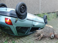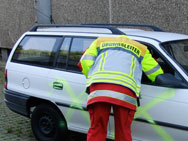 Vor Übungsbeginn: Ein kurzer Blick auf eines der Unfallfahrzeuge.Ein Rettungswagen wurde über Funk alarmiert: Verkehrsunfall auf einer Landstraße, mehrere PKW beteiligt. Als erstes Fahrzeug an der Einsatzstelle gab der RTW seine Rückmeldung: Verkehrsunfall, vier PKW beteiligt, 12 bis 15 verletzte Personen, mehrere Personen eingeklemmt oder eingeschlossen, weitere Kräfte erforderlich.