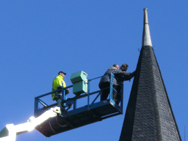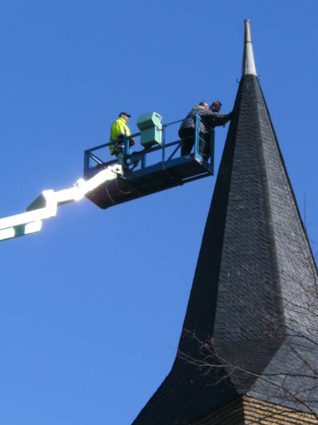 Nach den ersten Sturmböen: Das Kreuz der Kirche hängt am seidenen Faden. Das abgerissene Kreuz der Kirche in Libur ist mit den Mitteln der Feuerwehr nicht effektiv zu bergen, auch eine Drehleiter reicht nicht aus.