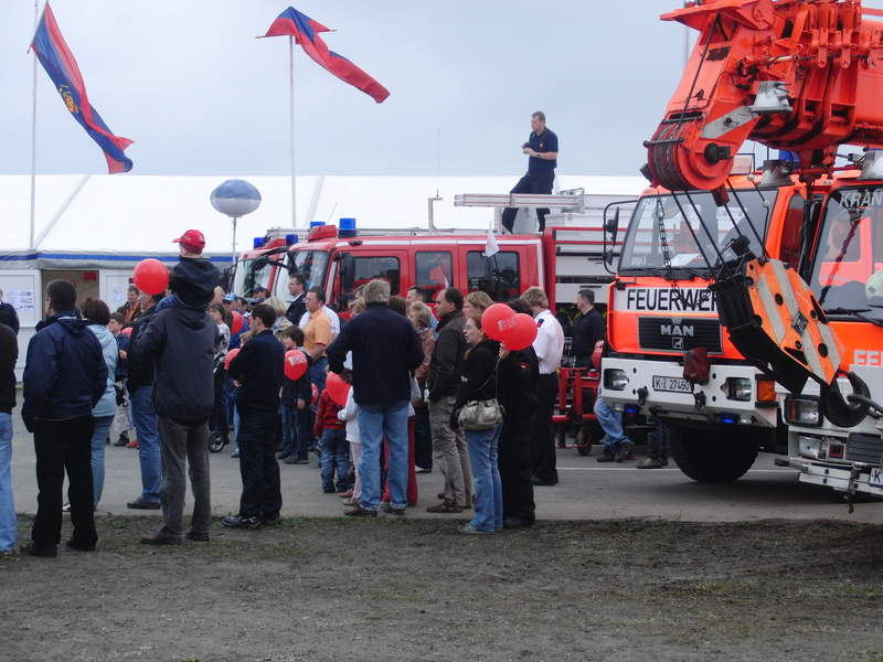 Der Festplatz füllt sich mit Fahrzeugen. Vorne hat sich der Gerätewagen Wasserrettung der Berufsfeuerwehr Köln aufgebaut, dahinter schiebt sich das RIV der Flughafenfeuerwehr Köln/Bonn auf den Platz.