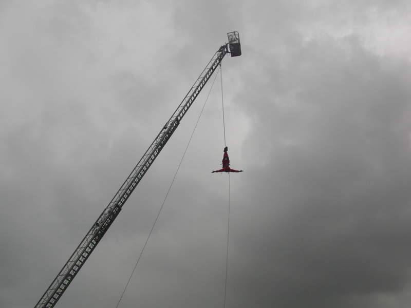 Die Höhenretter (stationiert auf Feuerwache 4 in Köln-Ehrenfeld) bereiten sich auf ihre Vorführung an der Drehleiter vor.