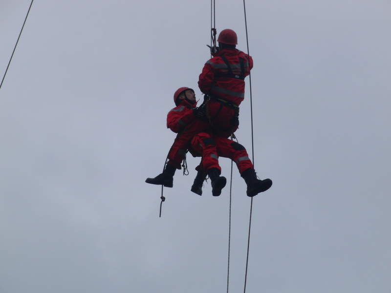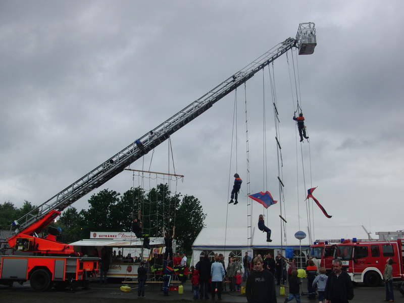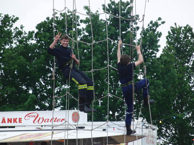 Klettern wie die Höhenretter: Die jungen Gäste versuchen sich am Kletterparcours.Am späteren Nachmittag folgte dann nach einer weiteren kräftigen Regenschauer eine Vorführung zum Thema Patientengerechte Rettung aus verunfallten Kraftfahrzeugen. Die