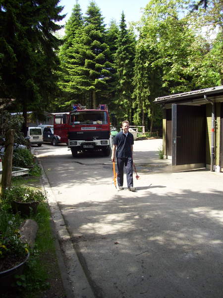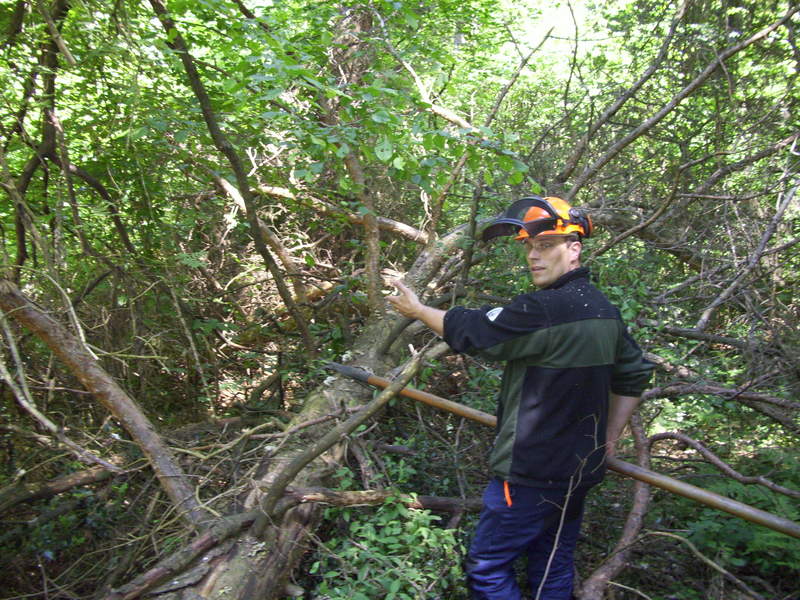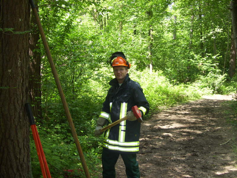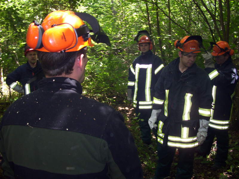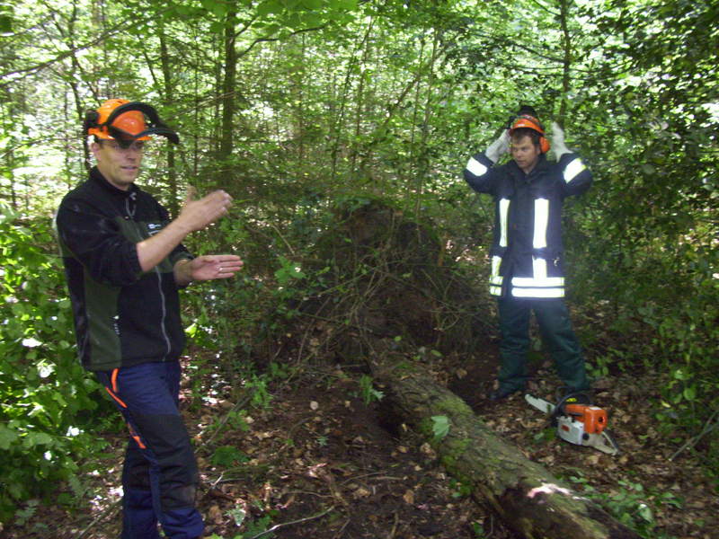 Nachdem jeder von uns im Fotoband der Feuerwehr Köln auf unserem Foto unterschrieben hatte, verbrachten wir den Vormittag mit einer kurz gefassten Theorieeinheit über die Sicherheit beim Arbeiten mit der Motorsäge. Diese ist unerlässlich, da statistisch betrachtet im Berufsbild der Forstwirtschaft jeder Dritte einen Arbeitsunfall erleidet. Außerdem wurde uns die Technik einer Motorsäge sehr anschaulich erklärt. Mit diesem Wissen nahmen wir einige Kniffe mit nach Hause, mit denen wir in Zukunft kleinere Schäden und Fehlfunktionen an der Motorsäge selbst beseitigen können. Nach einer recht kurzen Mittagspause ging es nun endlich zum praktischen Teil des Tages über. Jeder Teilnehmer wurde mit Schnittschutzhose und Helm ausgestattet und Sägen, Werkzeug, Fällheber, Äxte und andere Spielereien eingepackt. Nach einer 30-minütigen Waldrundfahrt fanden wir endlich geeigneten Sturmwurf, der ausreichend verkeilt war, um die Auswirkungen von Druck- und Zugkräften im Holz anschaulich kennenlernen zu können.