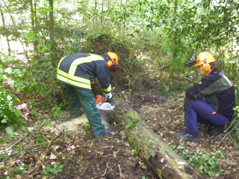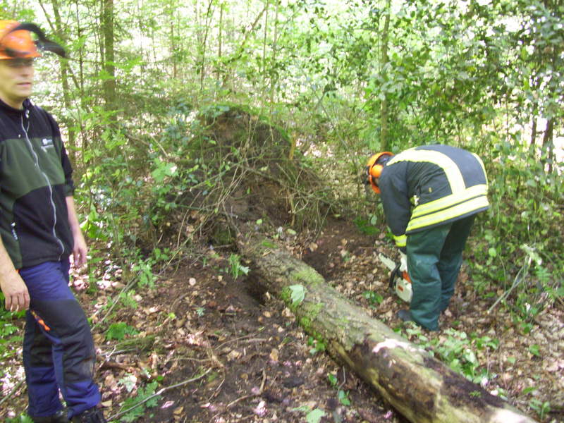 Ein umgestürzter Baum mit Wurzelteller (im Hintergrund) erfordert besondere Vorsicht.Anschließend durfte jeder einige Stücke aus dem Stamm abtrennen. Vorher wurde jedoch jeder Schnitt gemeinsam besprochen. Während des praktischen Teiles wurde die Motorsäge nur ein einziges Mal durch zu hohe Druckkräfte im Holz eingeklemmt, das einen guten Schnitt für einen solchen Lehrgang darstellt.