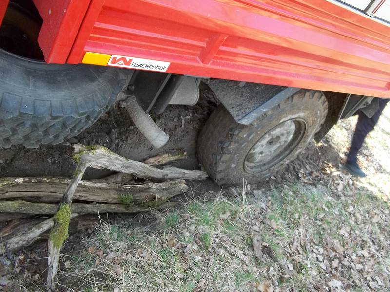 Kurz nach diesem „Zwischenfall“ war es dann unser RW der sich bei einer Hangabfahrt festfuhr. Er steckt dabei zwar nicht wirklich in einem Schlammloch fest, sondern saß auf einem herausstehenden Stein fest. Um sich aus dieser Lage zu befreien mussten alle erst mal Grübeln. Nach kurzem Überlegen entschloss sich ein Mitglied unsere Löschgruppe dazu ein Rad des Rüstwagen mit Holz zu unterlegen um dadurch das Fahrzeug höher zubekommen. Gesagt getan und siehe da der RW konnte den Stein überwinden. Danach kam es zu keinen weiteren Vorkommnissen und alle Fahrzeuge und Teilnehmer konnten die Ausbildung ohne Schäden zu Ende bringen.