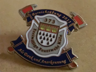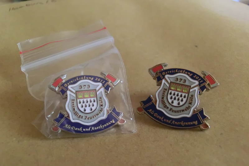 Schönes Andenken: Eine Anstecknadel als Erinnerung an den Übungstag.Für die an der Übung beteiligten Kameraden der Löschgruppe Libur war es ein interessanter und lehrreicher Tag. Abschließend gilt unser Dank den Organisatoren dieser Bereichsübung sowie allen Übungsbeobachtern, den teilnehmenden Mitgliedern der Berufsfeuerwehr Köln, allen Statisten, dem THW und nicht zuletzt den beteiligten Hilfsorganisationen. Danke für diesen Tag!