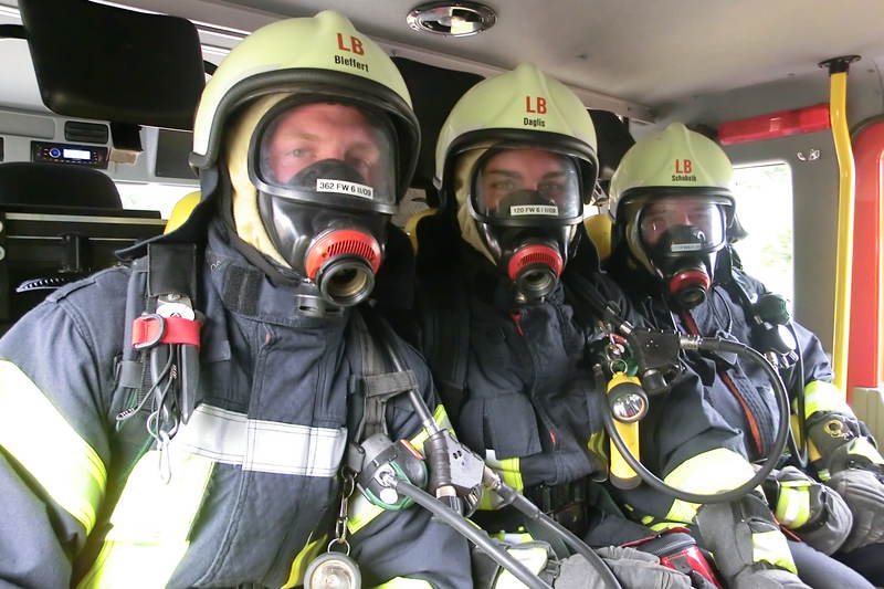 Nach der Übung bei der Deutz AG: Dem Angriffstrupp aus Libur ist die Anstrengung deutlich anzusehen.Die letzte Übungsstation an diesem Tag wurde von uns schon mit Spannung erwartet, handelte es sich doch um eine Einsatzübung, bei der die technische Hilfe im Vordergrund stand. Die Löschgruppe Libur verfügt als eine von