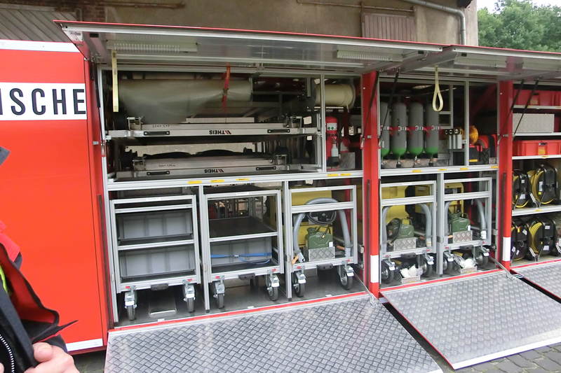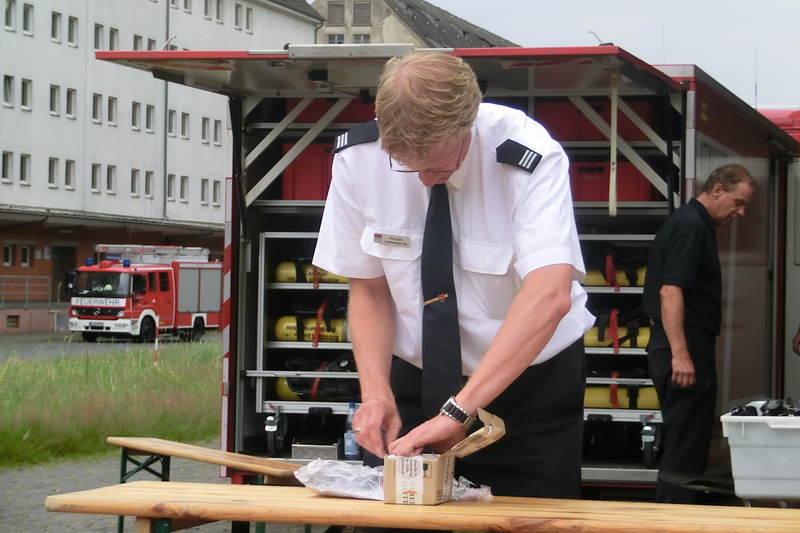 Teamspiel-Lösung mit dem „Liburer Modell“: Wo andere Teams einen Kran bauten, griffen wir schnell und effektiv zum großen Hebel.Die nächste praktische Übung stellte da schon ganz andere Anforderungen an die Teilnehmer: Im Fluchttreppenhaus der ICE- und S-Bahn-Trasse, die zum Flughafen KölnBonn führt, wurde ein Brand angenommen. Die Löschgruppe Libur war bei dieser Übung zusammen mit der Löschgruppe Heumar eingeteilt und als erstes Fahrzeug am Ort. Schnell wurde die Lage durch den Gruppenführer erkundet, der seinen Angriffstrupp in das Fluchttreppenhaus schickte. Dort wurde recht bald eine der zwei vermissten Personen gefunden und aus dem Treppenhaus geführt. Zeitgleich begannt der Angriffstrupp der in der Zwischenzeit eingetroffenen Löschgruppe Heumar seinen Abstieg in das Treppenhaus und meldete wenig später, dass auch die zweite vermisste Person gefunden wurde.